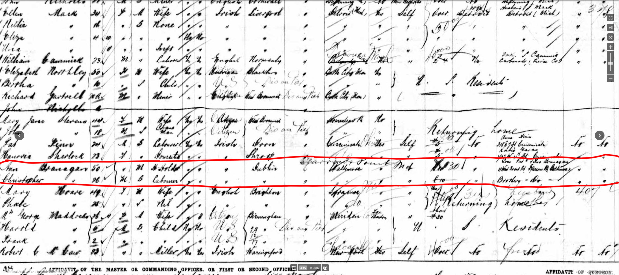 The next day, I again revisited Nanny’s paperwork on her family tree. Her paperwork said that Patrick Branagan was from Ireland, but family’s names were unknown. That matched up with what I had seen on the death certificate. But I noticed more information in the family files. It said that he may have had a brother named Christopher who had a wife named Nora.
