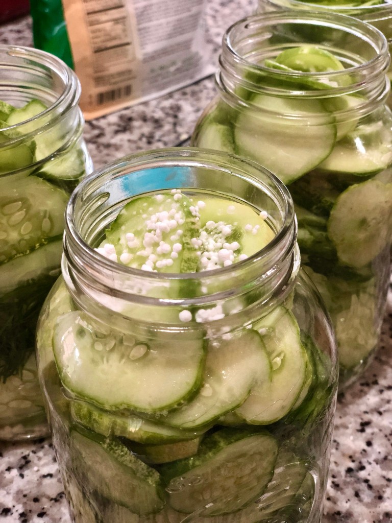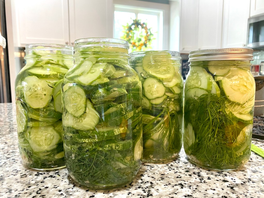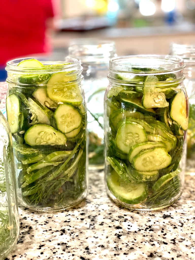 At this point, you can put your lids and put straight in the fridge or can water bath them for about 15 minutes so they will seal. We just prefer to keep them in the fridge for a few days and eat them from there. If you plan to water bath them, I do think thicker slices or spears keep their crispness longer. Honestly, I haven’t found a great recipe that keeps pickles super crisp for more than a few months, so I stopped trying to make some that survive the winter. We just enjoy them all throughout summertime. I’d love to hear if anyone has suggestions!