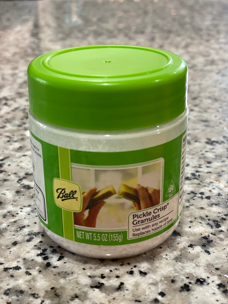 Next, I add Ball Pickle Crisp granules. This product really does make a huge difference and gives you really crispy pickles! The directions are on the package, but it only takes a heaping 1/4 teaspoon in each quart.
