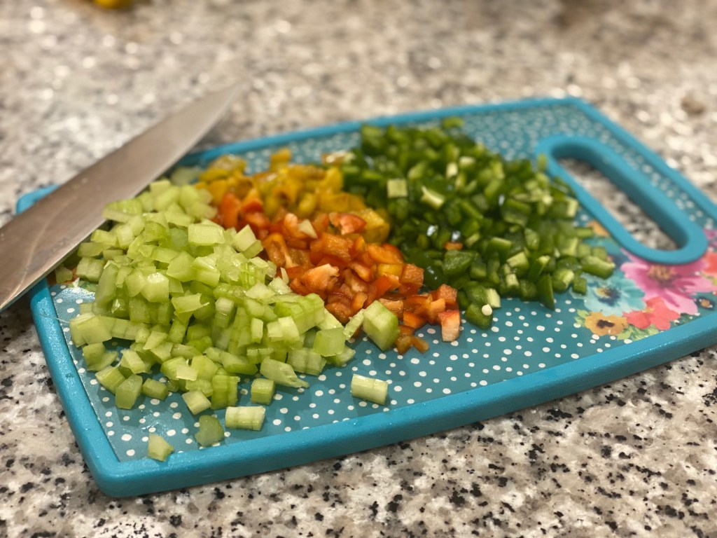- Chop peppers, onions, and celery and add to pot. Add minced garlic. I like to dice mine pretty small. Such pretty colors!