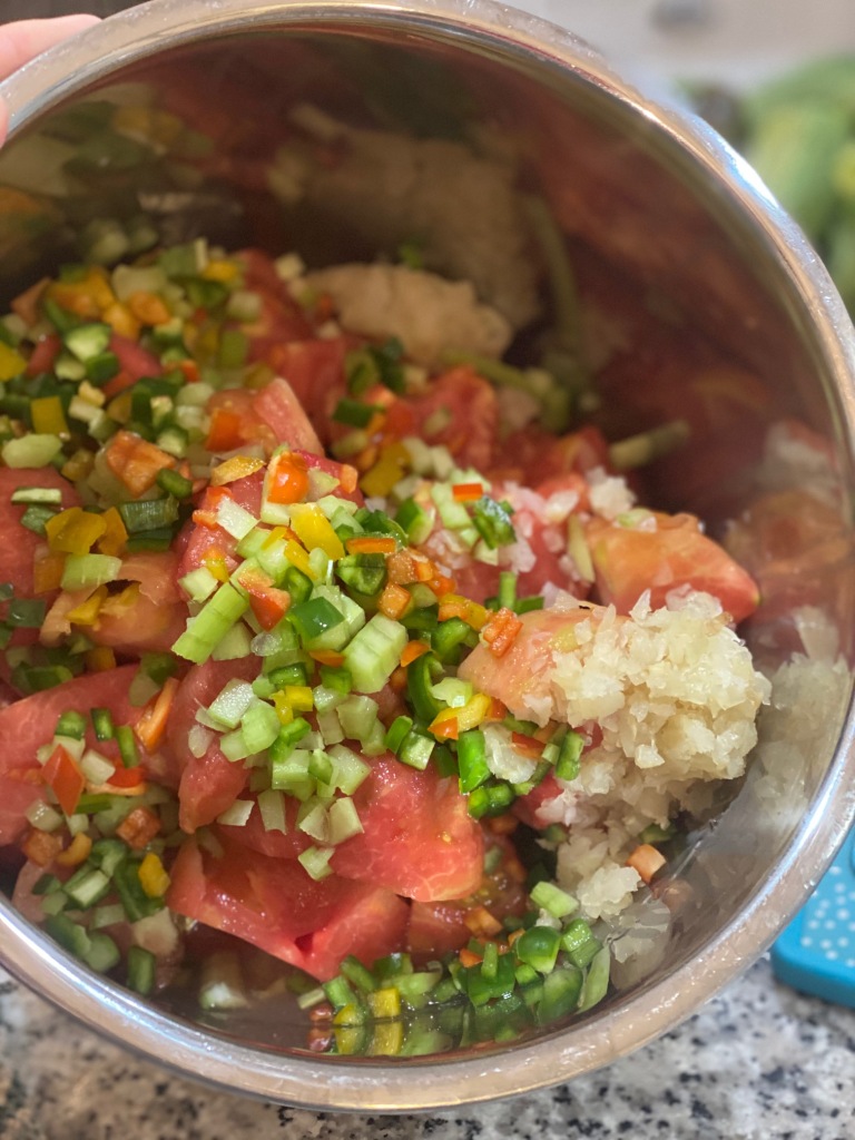 - Scald, peel, and chop tomatoes and put in a large pot or Instant Pot. (I use the Instant Pot, but can only do half the recipe at a time.)