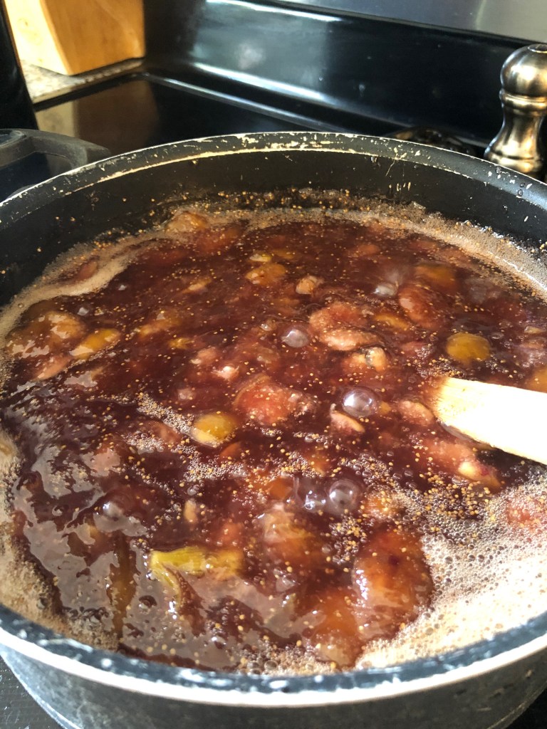 Add your sugar, water, lemon juice, and stir. Put on medium heat and as they start to soften, smash them up as much as you can. You’re going to continue this for at least an hour. I’ll be honest-it looks pretty disgusting in the process. Eventually, the figs will start to caramelize a little and it will start to look more glassy instead of just clumpy. Your figs will become more translucent. I continue to chop and smash them as I prefer a more smooth fig preserve. Be patient-keep stirring so it doesn’t stick. You’ll eventually keep a low rolling boil and can adjust the heat to a little lower if it starts to pop up too much.