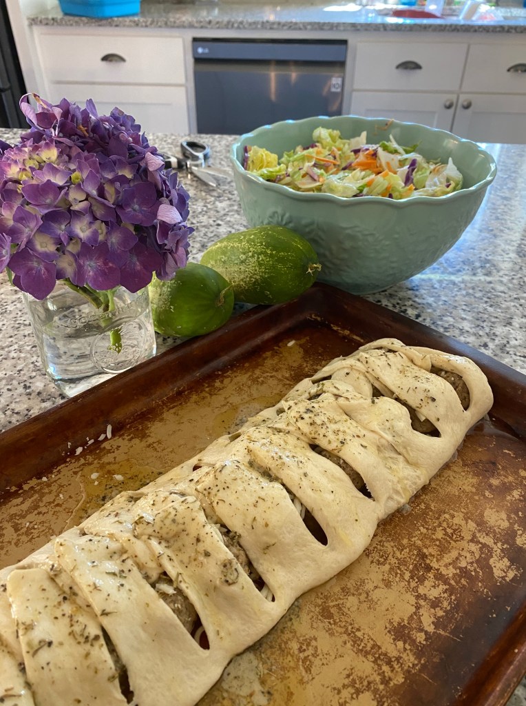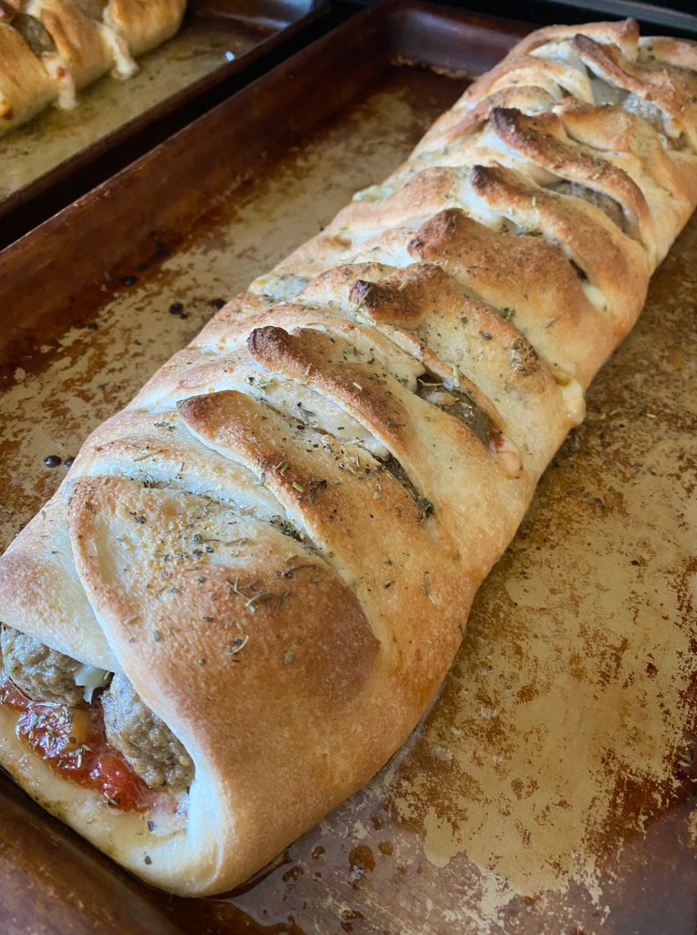 Now you’ll bake it according to the directions on your pizza dough. Cook until golden brown! Slice and dip into marinara.