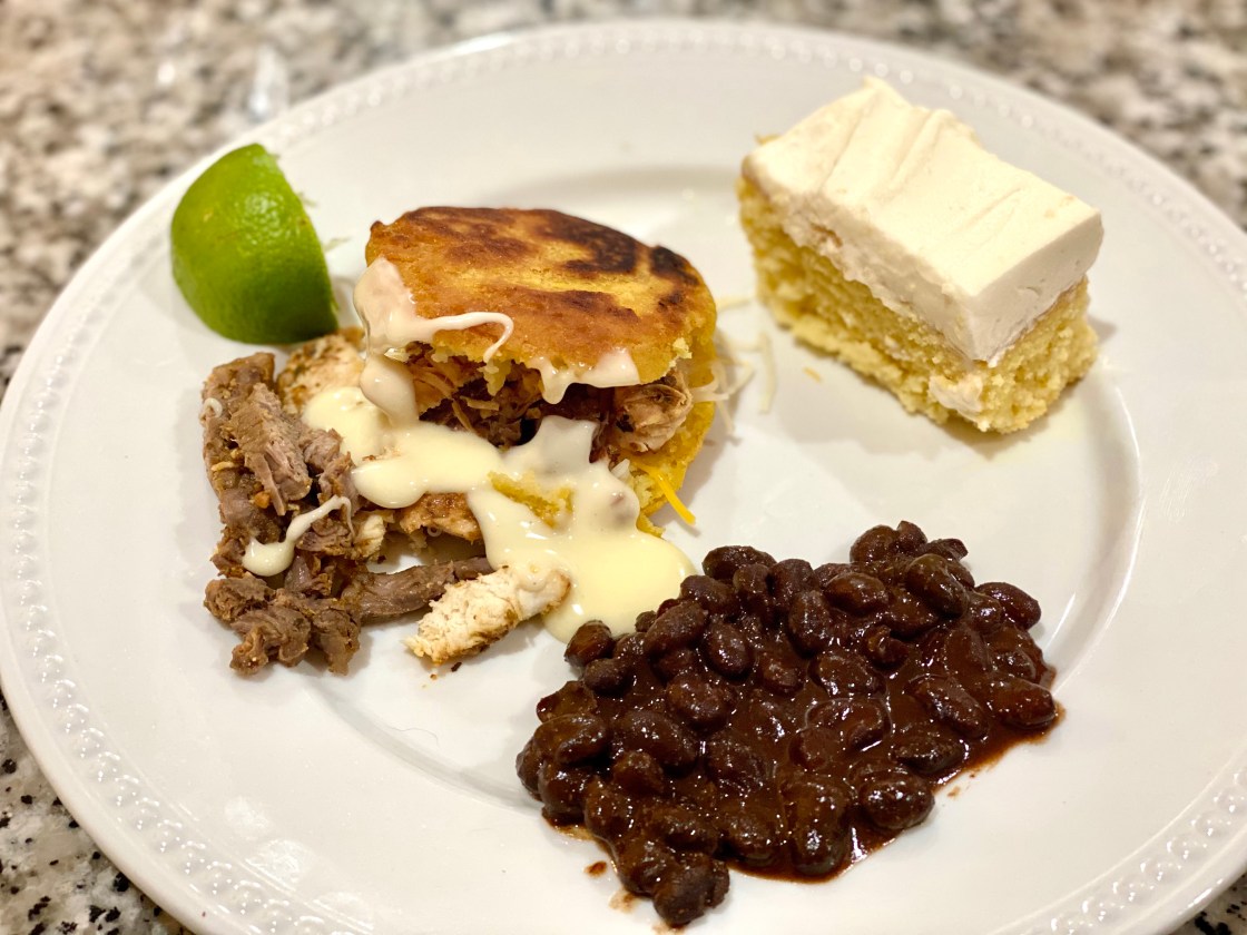 Arepas are basically thick, fried masa cakes that are finished off in the oven. They are smaller and thicker than a tortilla, so the oven assures that they finish cooking in the middle. Then you stuff it with whatever you’d like. We chose our favorite marinade, featured earlier on my blog here. It has chipotles, orange juice, lime, olive oil, vinegar, and lots of spices. So flavorful! Then we had a side of black beans with some taco seasonings and lime added. (Black beans seem to be very common in Venezuela.) Dessert was a Tres Leches Cake and was cold and sweet! I’m not a huge fan of the texture of Tres Leches Cake, but it was still pretty good and a few bites made a nice ending to the meal.