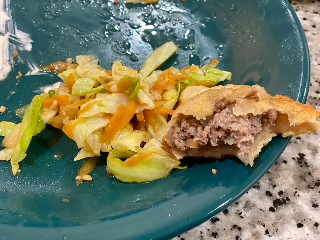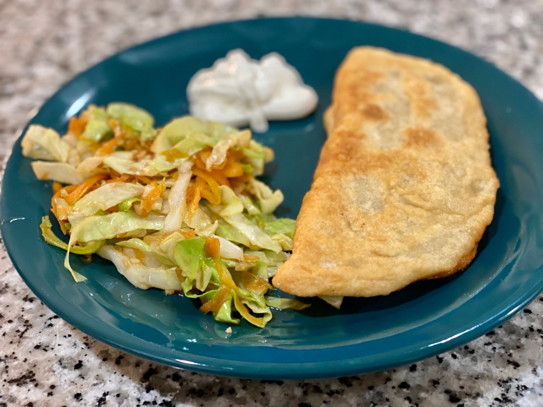 So I searched and decided on Khuushuur, a fried pocket of ground meat. It is pretty plain and can be dipped in sour cream. Then I sauteed my own vegetable mixture with cabbage, carrots, onions, garlic, ginger, and soy to add something fresh to the meal.