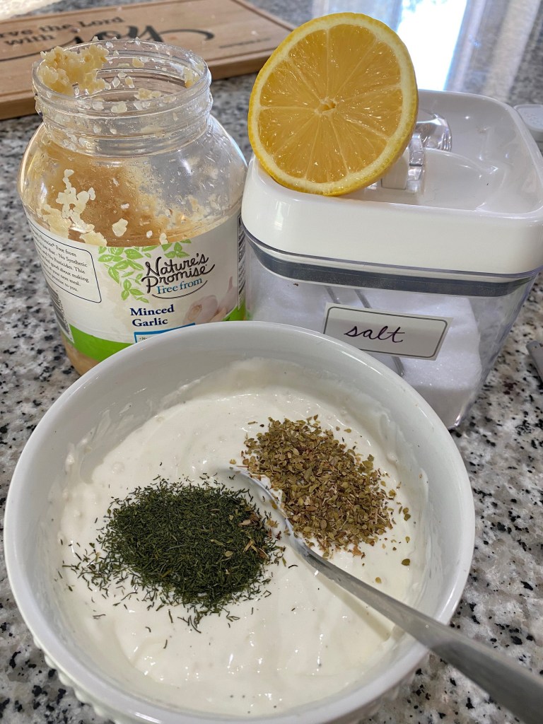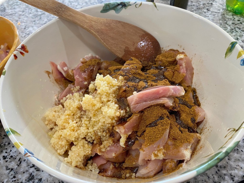 When researching, I found the site Recipetineats and just used her recipes from her blog post as they sounded so good and easy to prepare. (Find the link to her post here.) I actually had shawarma seasoning already that I had bought from an ethnic grocery store in the fall. I teach a class called “Globetrotters” at our homeschool co-op, and I had prepared beef shawarma for them when we studied Saudi Arabia. So I followed the instructions on the bottle yesterday and let it marinate for 24 hours.