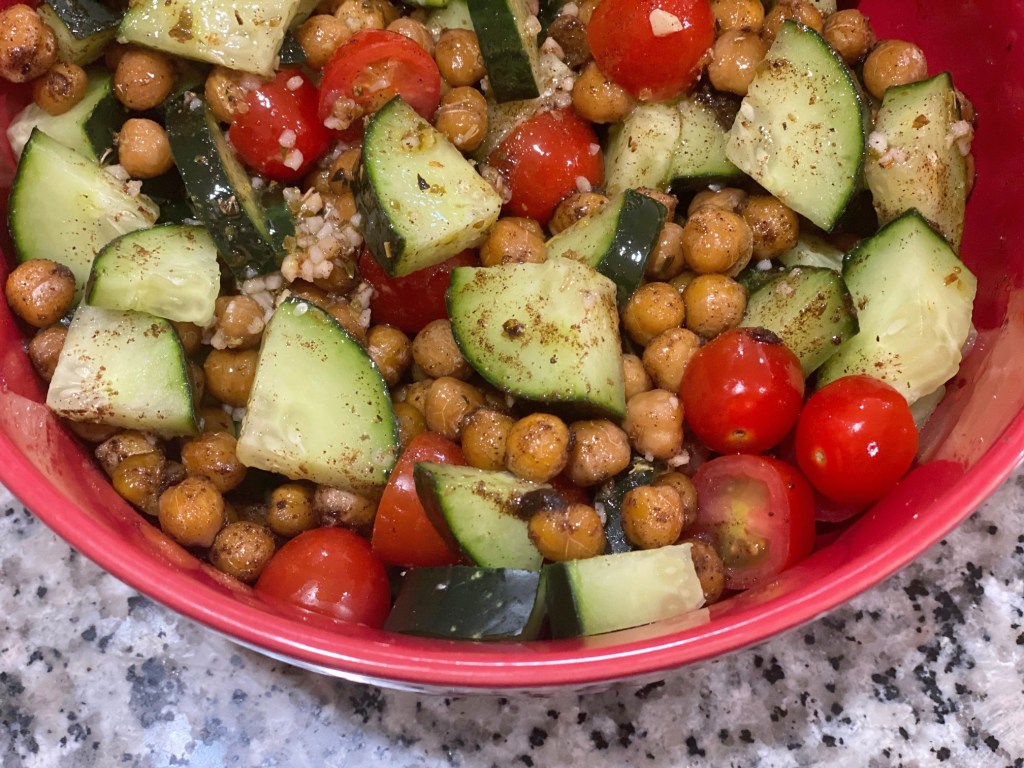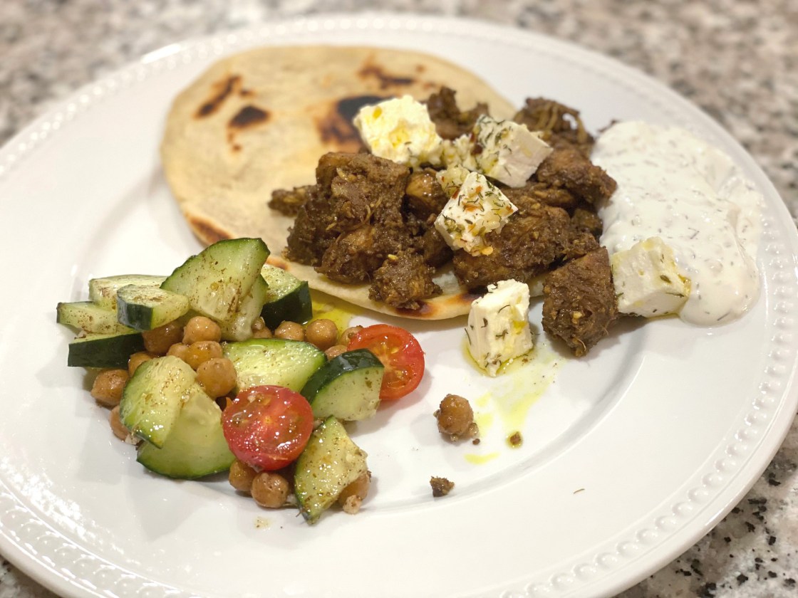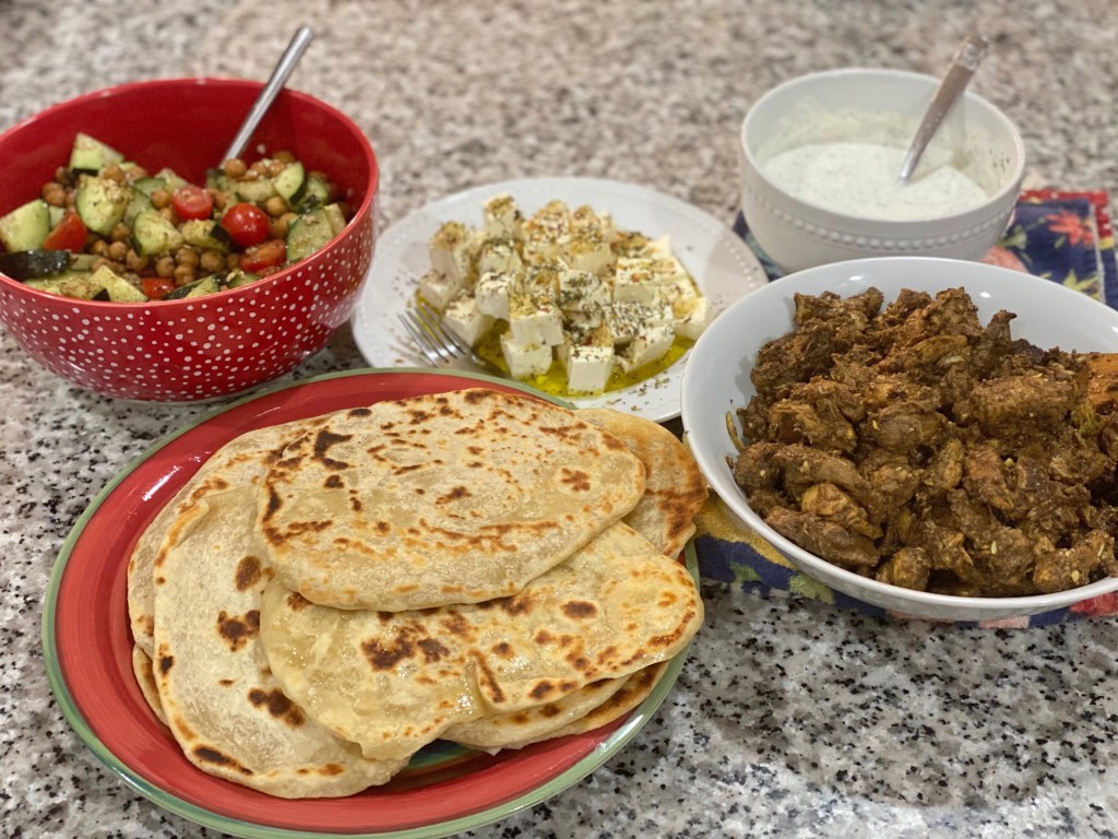 We decided that the other components would be flatbread, a yogurt sauce, marinated feta, and a roasted chickpea salad with lemon dressing. I’ll just share photos and let you see the recipes on the blog post, but we enjoyed the meal. The shawarma seasonings have a very warm feeling with cinnamon, ginger, etc. The yogurt sauce definitely helped freshen it up, along with the chickpea salad. My family didn’t like the chickpea portion of the salad as much as I did, but several of them aren’t a huge fan of any type of bean anyway. I thought the acid from the lemon dressing was really nice with what could be a warm and heavy meal.