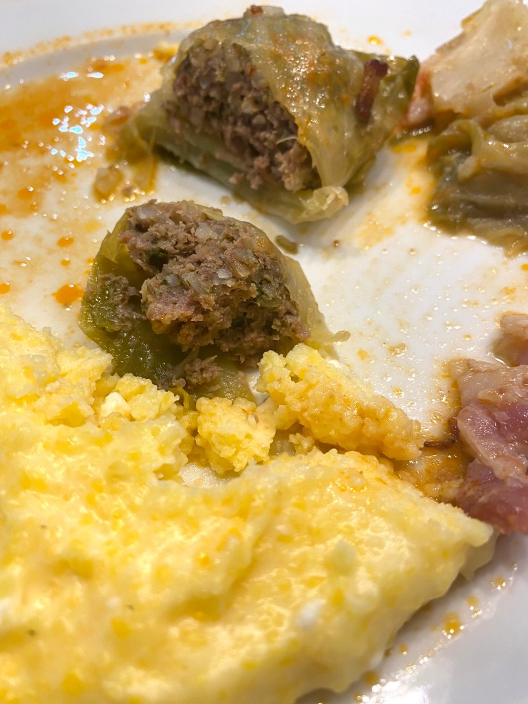 First, we made Sarmale, or cabbage rolls. The meat filling of the cabbage rolls had dill, parsley, onion, garlic, rice, ground pork, and ground beef. Romanians also tend to put bacon on top of theirs. The polenta was a creamy polenta cooked in milk with feta cheese inside. Gus hates grits (which are basically the same thing), but he loved these. He said he’ll eat them all the time if I make them that way. For the polenta, I just bought a bag of them and followed the instructions for a slow-cooking creamy version. We cooked them in milk with a tiny bit of cream. Then I added a small container of feta cheese and stirred it until creamy once the polenta was done cooking.