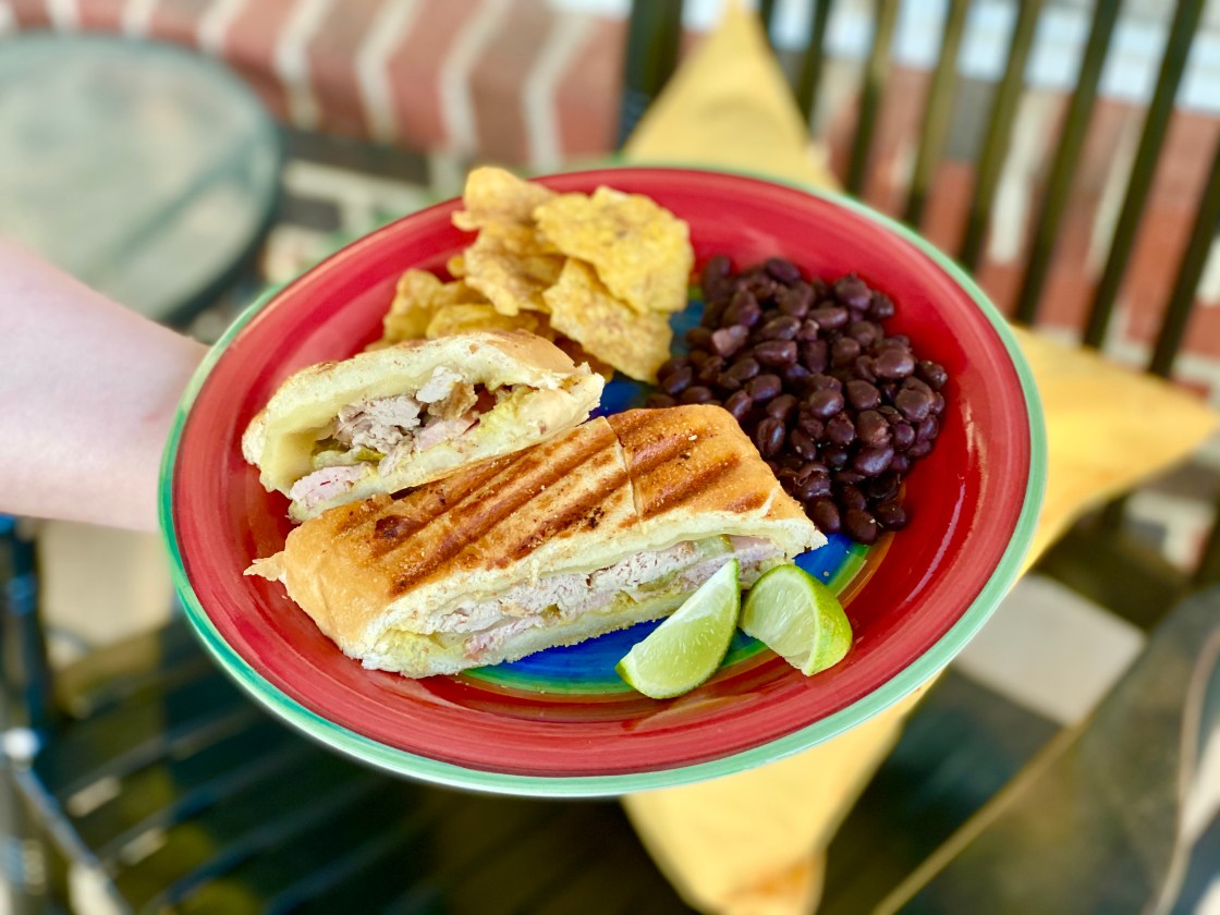 We of course had to make the Cuban sandwich, a grilled sandwich that has marinated pork, ham, Swiss cheese, mustard, and pickles. As sides, we had black beans and prebought plaintain chips (with lime flavoring…we love them). I didn’t have time to go to our closest Publix that carries the plaintain chips (about 35 minutes away), so I bought them on Amazon here.