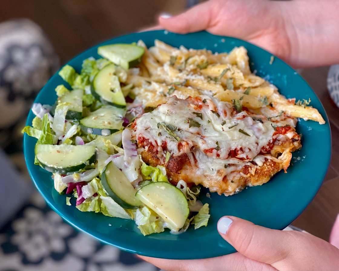 We decided on chicken parmesan, some penne noodles with homemade alfredo sauce (one of our absolute favorites), and a salad.