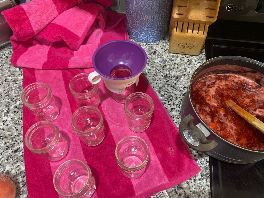 Follow the directions on your packet to make the jelly. That process honestly takes less than 10 minutes! Then have your clean, hot jars on your towel on the counter. Place your funnel on top and spoon your jelly into the jars. I usually just use a ladle or a measuring cup to scoop it into the jars. (During this time, I have a pot of water on my stove for my actual jars and start warming it up to boiling.)