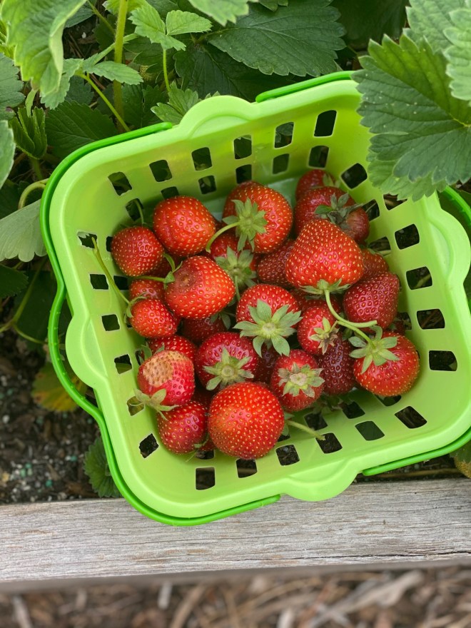 I’ve always wanted to grow my own, and I’m finally making progress this year. When I built my raised bed garden last spring, I built a 2 foot by 10 foot long bed for strawberries. That will comfortably fit about 20 strawberry plants. With strawberries, they will produce some their first year, but they really do better the 2nd year after they have gotten established. I planted those first 20 plants last year (10 Sweet Charlie variety and 10 Ozark Beauties) and they went crazy! Strawberries send off runners in order to keep producing new plants, so I ended up with a box full of plants! I cleaned it out in late winter and ended up having about 100 rooted strawberry plants! I kept 20 in my original box, made 2 more boxes of 36 plants total, and then shared about 50 extra plants with a friend!