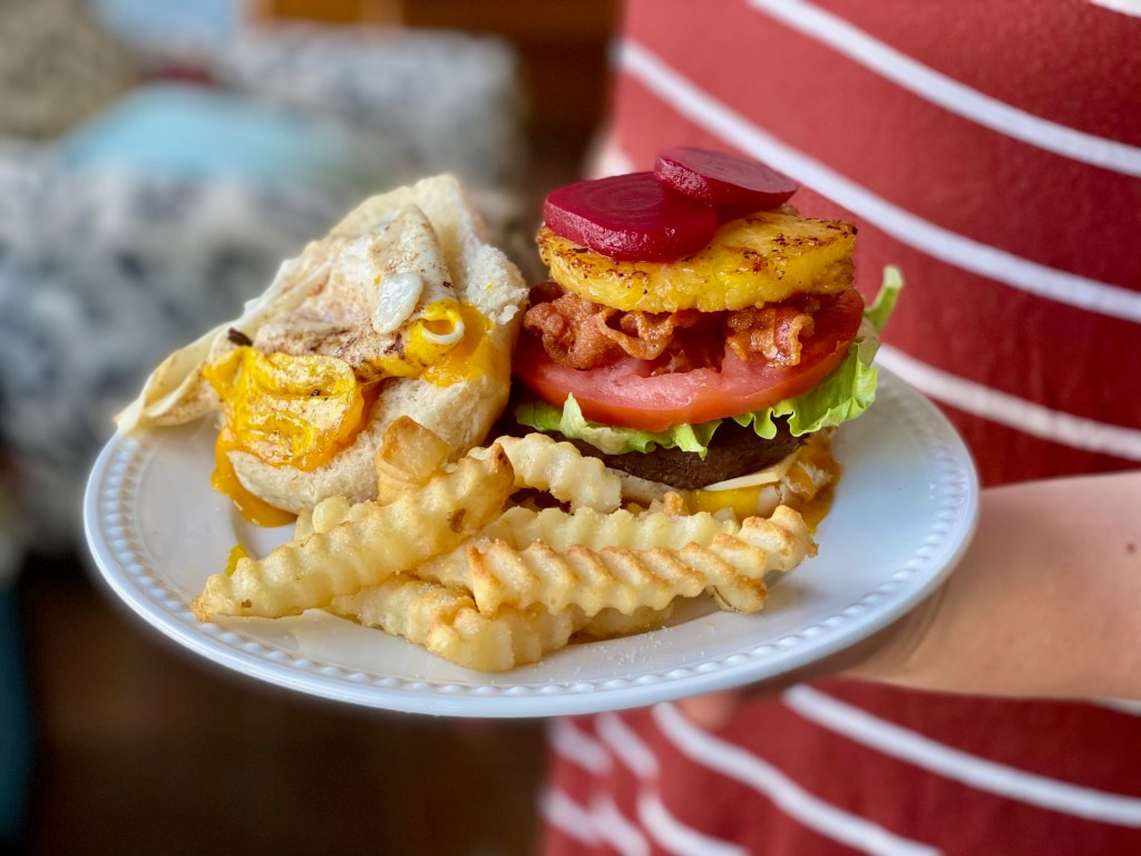 A burger with the lot can vary, but the common denominators I saw were a beef patty, cheese, bbq sauce, bacon, lettuce, tomato, grilled pineapple, a fried egg, and sliced beets! That’s a LOT of toppings!