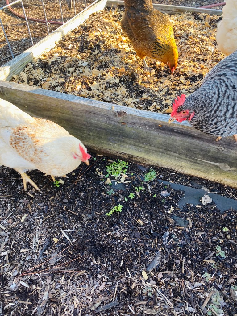 Usually my garden is off limits to my chickens, but I lured them in there today so they could do a little clean up while I worked. They ate up every little green plant that was scattered throughout the mulch and started scratching around in the beds, moving the soil around for me.