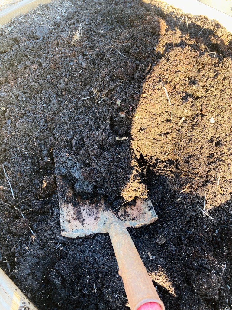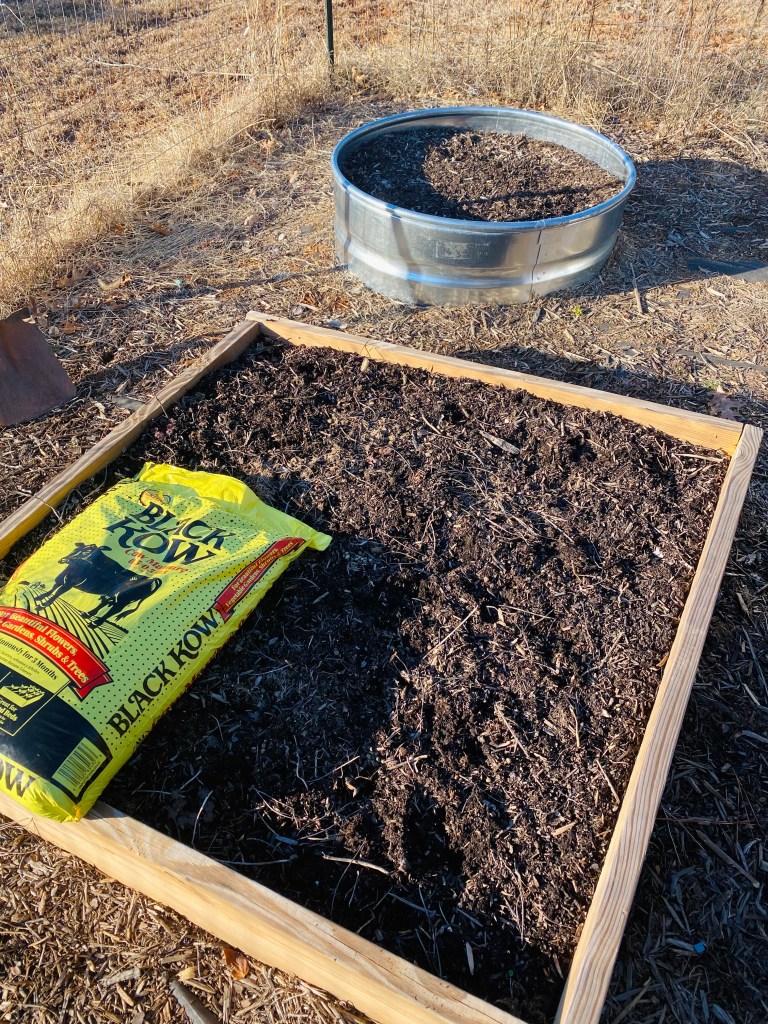 Now it was time to get my box ready for my onions. I do Square Foot Gardening (SFG) and most of my boxes are 4 foot x 4 foot. I chose my box and first dumped a bag of manure on it. With SFG, once your soil mixture has been established, you only need to add compost to it each year. I usually like to add a combination of composts, but this is what I had on hand. I’ll continue to fertilize this box as onions can be heavy feeders. I dumped the manure and then worked it into my box with a shovel.