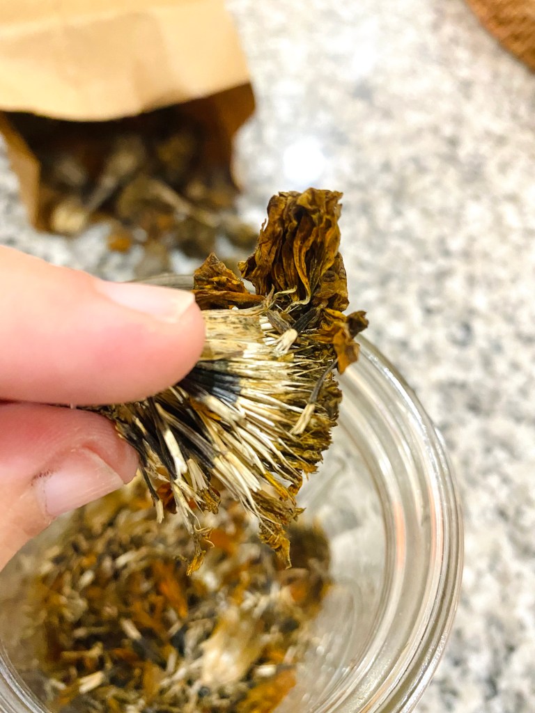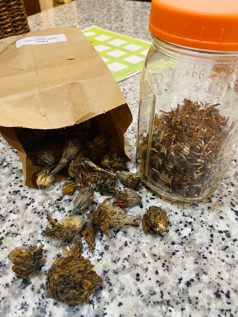 As I was working, I noticed some marigold heads that I missed last year. They are nice and dry now, so I plucked those off and later on, added them to my jar of dried marigold seeds. I also found some tulip bulbs in my seed bin that I forgot to plant, so I put those in the ground. I don’t think they’ll do anything this year, but hopefully they’ll produce next spring!